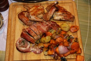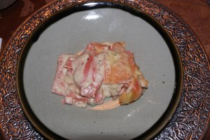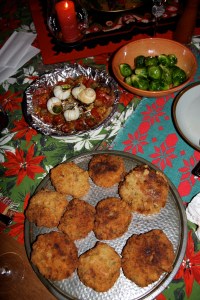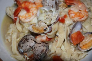 While every family has their own traditions, typically you eat baccalà (salted cod fish), calamari, scungilli (conch), anguilla (eel) and escarole stuffed with anchovies. And, in Michael’s family, it’s mostly fried. Michael doesn’t even like fried fish much—particularly not baccalà!—but it’s tradition. So, we bought some salted cod, fresh Dungeness crab (my absolute favorite—Maryland crabs don’t even compare), shrimp, calamari, and escargot (in place of the conch). We made a delicious seafood salad filled with pickled vegetables, crab and clams. Next on the menu was pasta allo scoglio, with homemade linguine, crabs and clams, and pasta aglio e olio (oil and garlic). Michael’s family typically makes aglio e olio, but we wanted to honor Pesaro with one of its most popular dishes, pasta allo scoglio. Plus, the Dungeness crabs were too good to pass up. Then, we made fried calamari and a twist on the usual fried baccalà: baccalà/potato cakes. We looked for escarole but it was very difficult to find in Oregon—several stores had it on order, but nothing came in before Christmas. As an Italian-American from New Jersey, Michael always marvels that grocery stores don’t have baccalà or escarole readily available. They had to specially order the baccalà—a few days later it came packaged in a delicate wooden box—a far cry from the hanging baccalà in the supermarkets in New Jersey or in the pescherie in Italy. The last time we spent Christmas in Portland we just went to the Asian markets and found all the fish we needed! The meal turned out great as you can see in these photos.