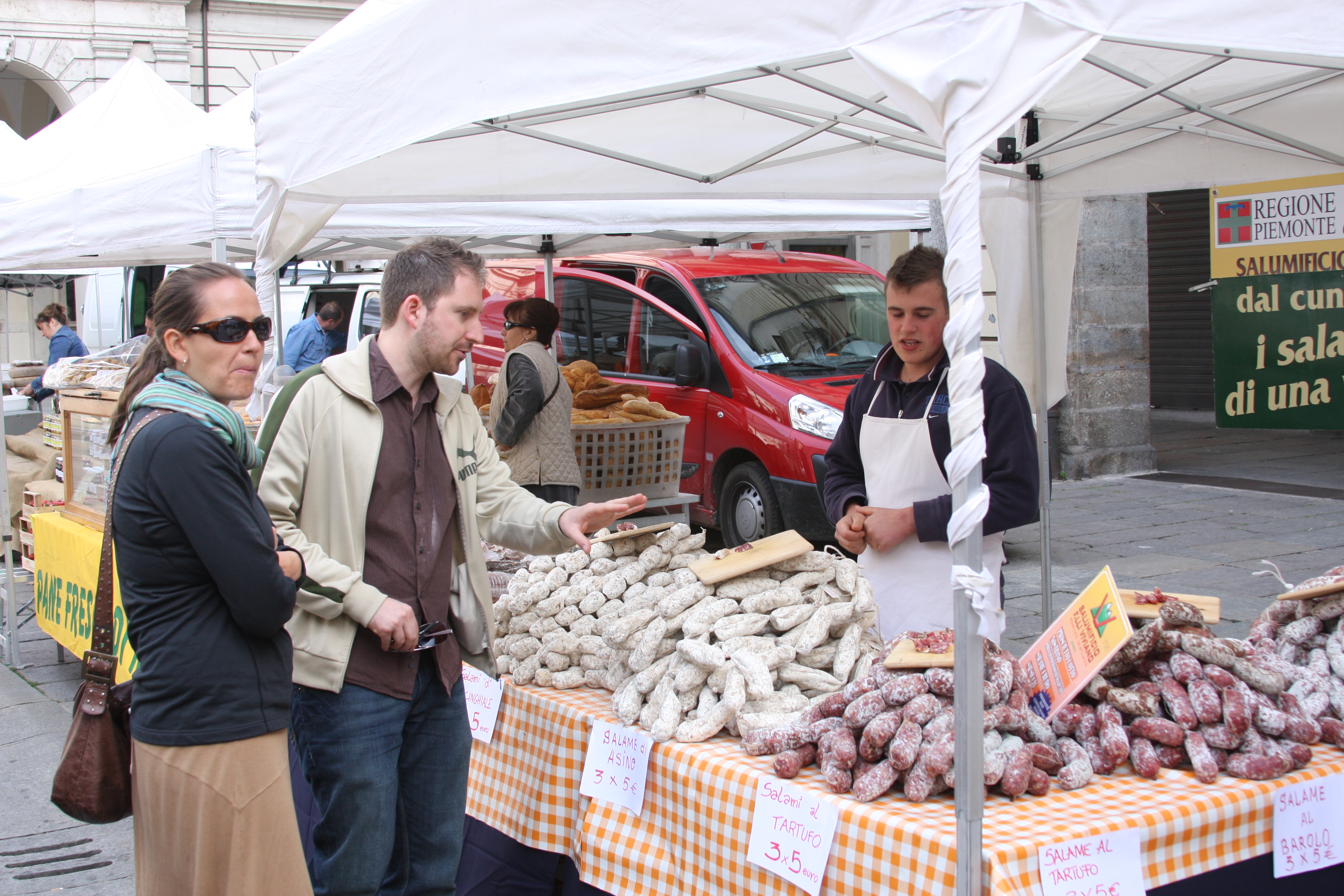 As I expected, the coffee was much better than in Venice. We sat outside, overlooking a bustling market, and Rob and Staci bought some fresh cheeses from the Alpine area outside of Turin (a Fontina and brie goat cheese), fresh bread and fresh meats (sausages flavored with truffles, rabbit and boar). The meat was so fresh it literally melted in your mouth.