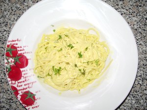 I’m taking liberties with the title of this recipe. Although there are many variations, I believe that a true Roman carbonara is made with eggs, pancetta, and grated Pecorino Romano cheese; in addition to the lemon, this one uses heavy cream (a common yet inauthentic ‘addition’ in many restaurant carbonara sauces), and leaves out the crispy pancetta. But I saw this recipe back in springtime, when lemons were in season, in a La Cucina Italiana magazine. We made it once and it was delicious; I unfortunately sent the magazine home, but today fiddled with the recipe and this tasty version came out.