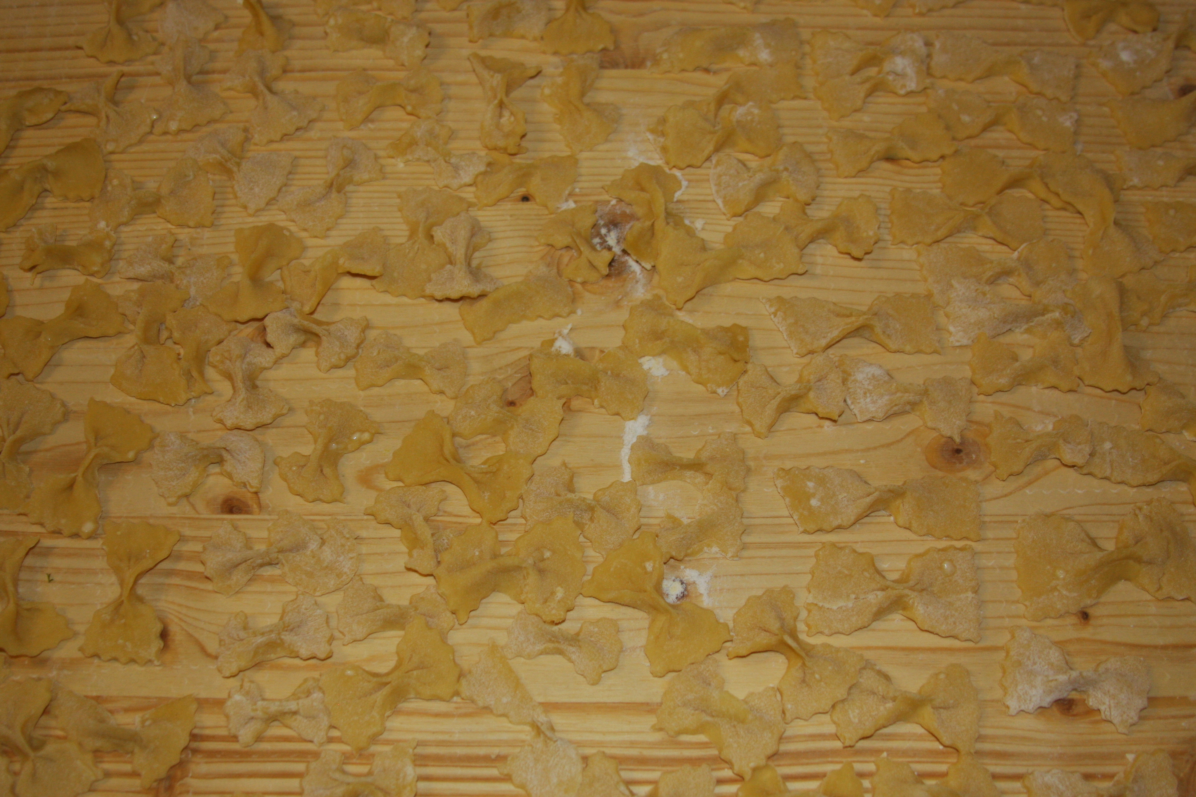 Mix the flours and salt together in a bowl. In a separate bowl, beat the eggs and oil together. Add the beaten egg mixture to the flour. Mix together until you form a ball of dough. (You can tell when the dough is right by the following: add more water until the mixture forms  a cohesive ball of dough. If the ball of dough sticks to your hands, however, work in more 00 flour until it doesn’t stick.) Roll out the dough onto a flat board and let it sit until it isn’t gummy anymore, but is still soft. (If it cracks when you pick it up, you’ve left it too long). An hour or so should do it. Then cut the dough lengthwise into ¾-inch wide strips. Cut these strips into 1-inch pieces, so that you have lots of ¾” x 1” rectangles. Pinch the middle of each rectangle together so they look like bowties (or butterflies). Hint: instead of using a knife, you can get a small wheel that looks like a small pizza cutter but the wheel is bevelled, which gives the pasta those zig-zag edges.