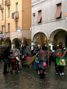 Our friend Luana and her family went to Urbania this year for the “Festa della Befana” which is a celebration that Michael and I attended last year. Urbania is a small medieval town close to the lovely Renaissance city of Urbino (it’s said that Urbino was spared from WWII bombing because the Allies mistakenly bombed Urbania instead). For the past decade, Urbania has branded itself as the birthplace of La Befana, similar to how Santa Claus resides in the North Pole. Children from all over Italy send letters to La Befana in Urbania. According to Samuele Sabatini, who organizes the Befana celebration in Urbania, “Babbo Natale (the Italian Santa) has a house at the North Pole, but nobody ever said where the Befana lived. So we decided that she lived here in Urbania. And the Befana has liked the location.” It’s true; Italians dressed as the good witch come from all across the country—we heard Neapolitans, Marchigiane, and Tuscans when we were there. The town hosts an annual week-long festival in early January in her honor, complete with fireworks, vendors selling local foods, and which culminates in La Befana riding down from the main bell tower to the ground, showering candy on the crowd. Tens of thousands of people attend—rain or shine.