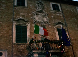 Last year, it was a cold, rainy day, but that didn’t hamper the festival—parents and children were gleefully sampling hot roasted chestnuts, waffles (they’re like funnel cake in Italy—Americans have them for breakfast, but Italians serve them at fairs) and hot chocolate. Large calze (stockings) hung from windows and doors around the town. According to Luana, one of the stockings is 50 meters in length, making the Guinness Book of World Records for the longest stocking. A mule led a parade of men, women and children—some on stilts—dressed in colorful witch costumes. We ducked inside a café to get two cappuccinos and warm up. The place was packed with locals and tourists. After sampling some delicious coffee, we proceeded to the main piazza where the real highlight of the day was about to happen—La Befana was going to fly. As it turned out, and to the delight of all the children, dozens of different befane peered out from windows in the town hall, waving and throwing candy to the crowd below. We ducked under a large umbrella and peered up to the bell tower, where the Mayor of Urbania gave a speech. Then, the strega was lowered on ropes, appearing to fly on her broom across the piazza. A burst of fireworks followed, lighting up the darkening sky.