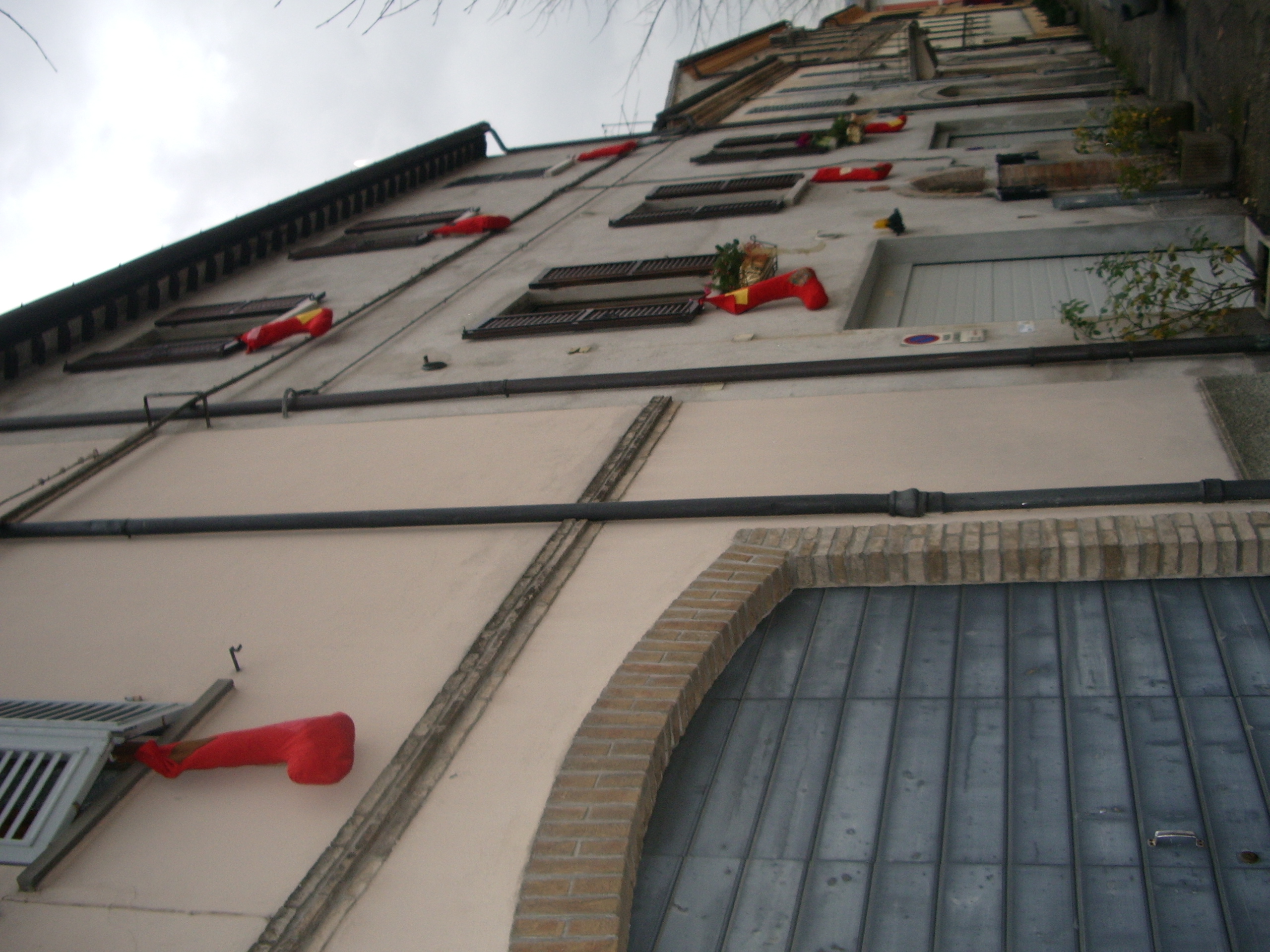Last year, it was a cold, rainy day, but that didn’t hamper the festival—parents and children were gleefully sampling hot roasted chestnuts, waffles (they’re like funnel cake in Italy—Americans have them for breakfast, but Italians serve them at fairs) and hot chocolate. Large calze (stockings) hung from windows and doors around the town. According to Luana, one of the stockings is 50 meters in length, making the Guinness Book of World Records for the longest stocking. A mule led a parade of men, women and children—some on stilts—dressed in colorful witch costumes. We ducked inside a café to get two cappuccinos and warm up. The place was packed with locals and tourists. After sampling some delicious coffee, we proceeded to the main piazza where the real highlight of the day was about to happen—La Befana was going to fly. As it turned out, and to the delight of all the children, dozens of different befane peered out from windows in the town hall, waving and throwing candy to the crowd below. We ducked under a large umbrella and peered up to the bell tower, where the Mayor of Urbania gave a speech. Then, the strega was lowered on ropes, appearing to fly on her broom across the piazza. A burst of fireworks followed, lighting up the darkening sky.